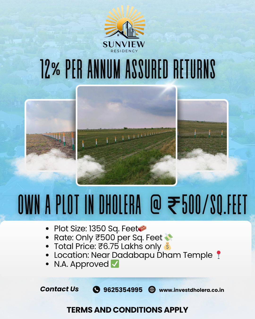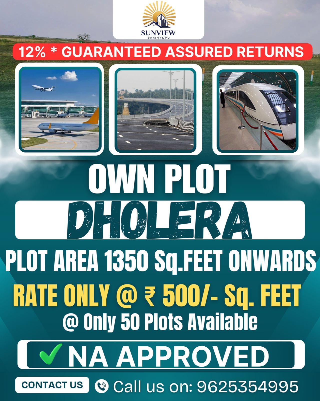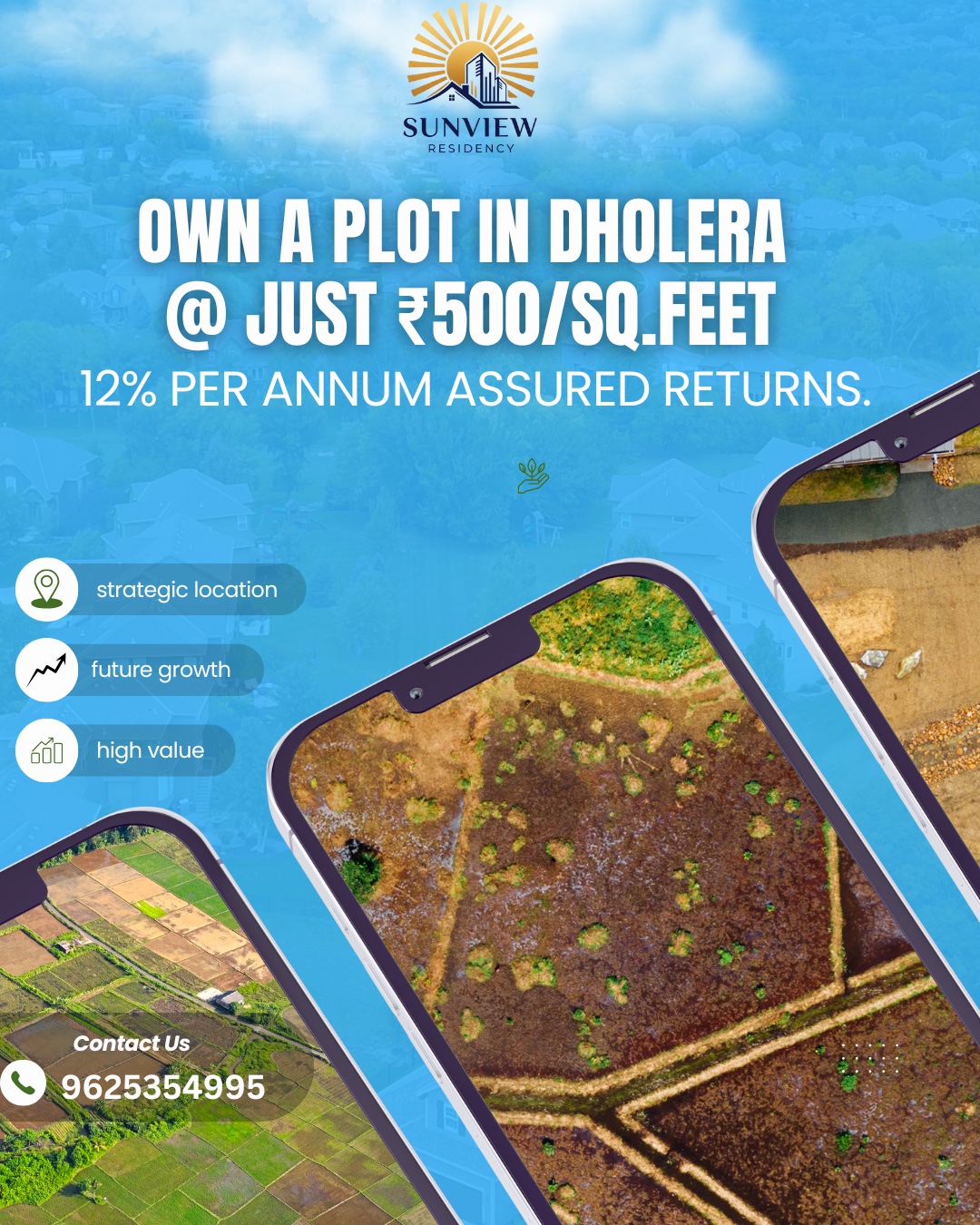 Sunview Residency is located on upcoming Gambh-Fatehpur Metal Road in near vicinity to the upcoming green field smart city- dholera having its own international airport, High Speed Metro from Ahmedabad and fully AI controlled area with number of salient features already given in dholera section.